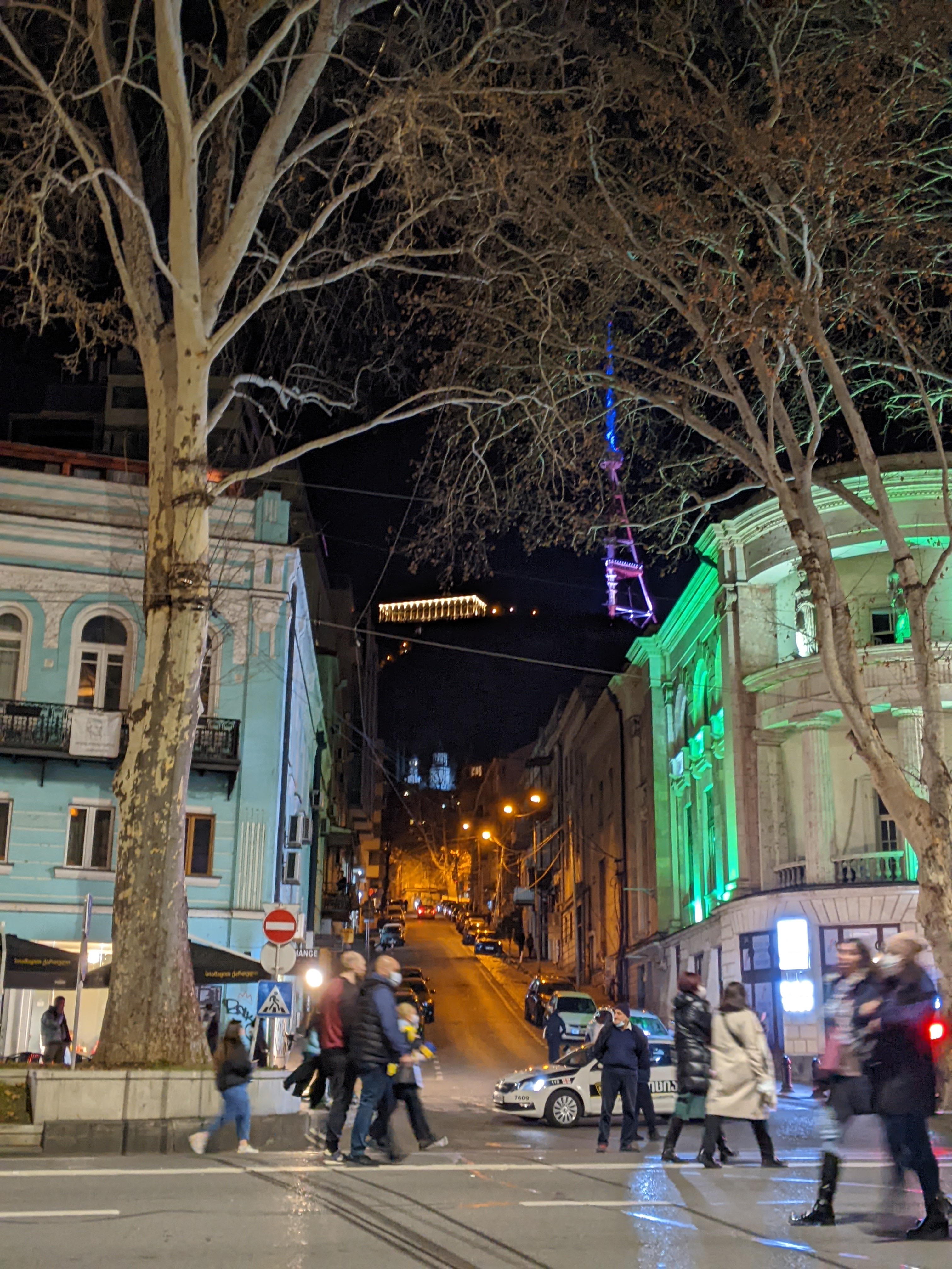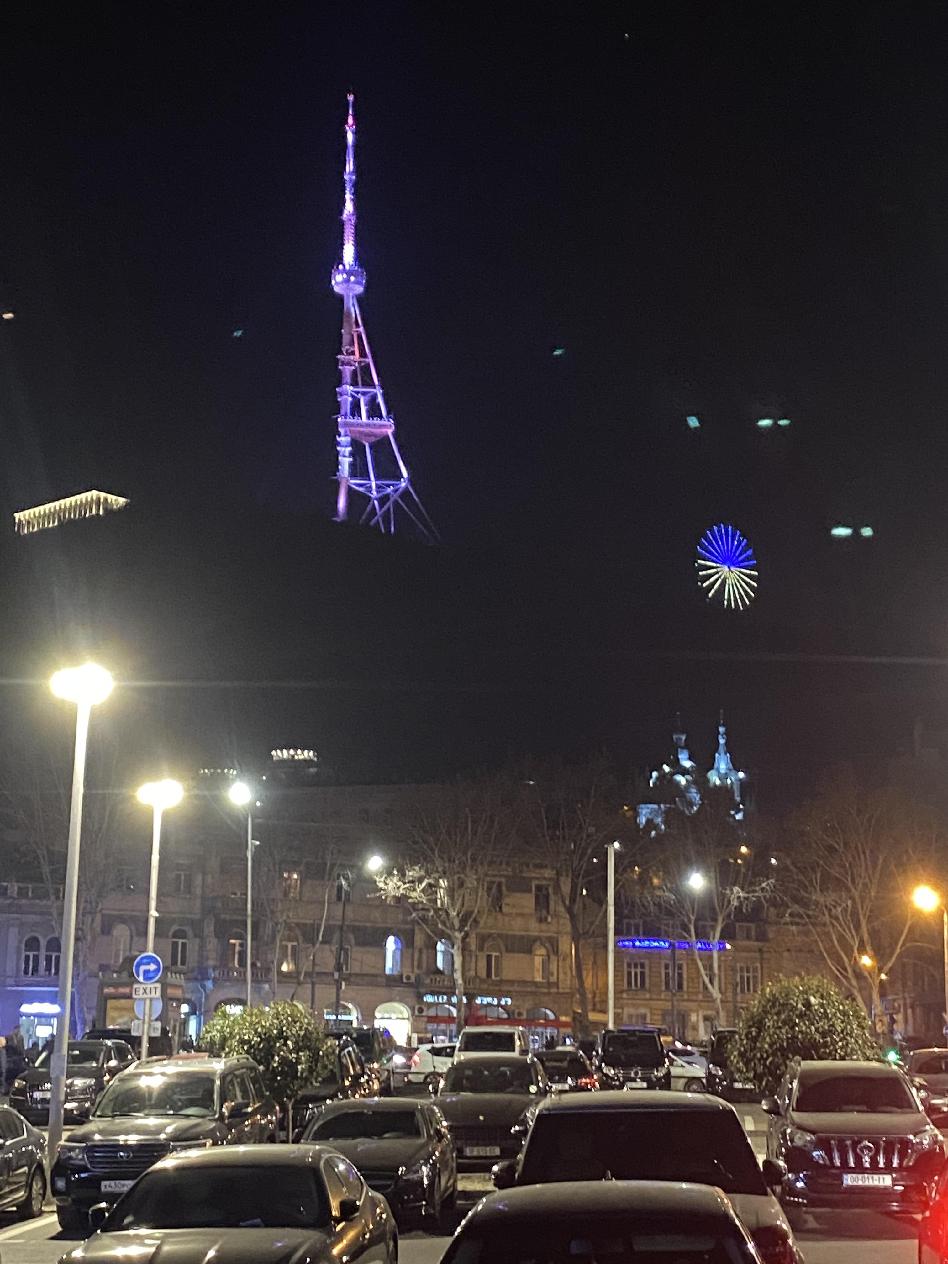 트빌리시 밤 산 위에 떠오른 노랗고 푸른 동그라미,