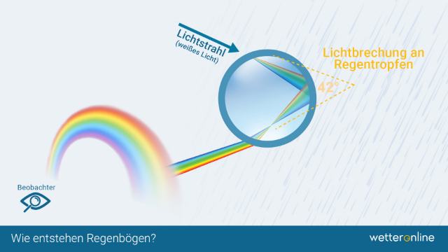 다른 스팩트럼 색상으로 분할되고 다시 반사되고 또 굴절되어 우리 시야에 무지개로 보인다.